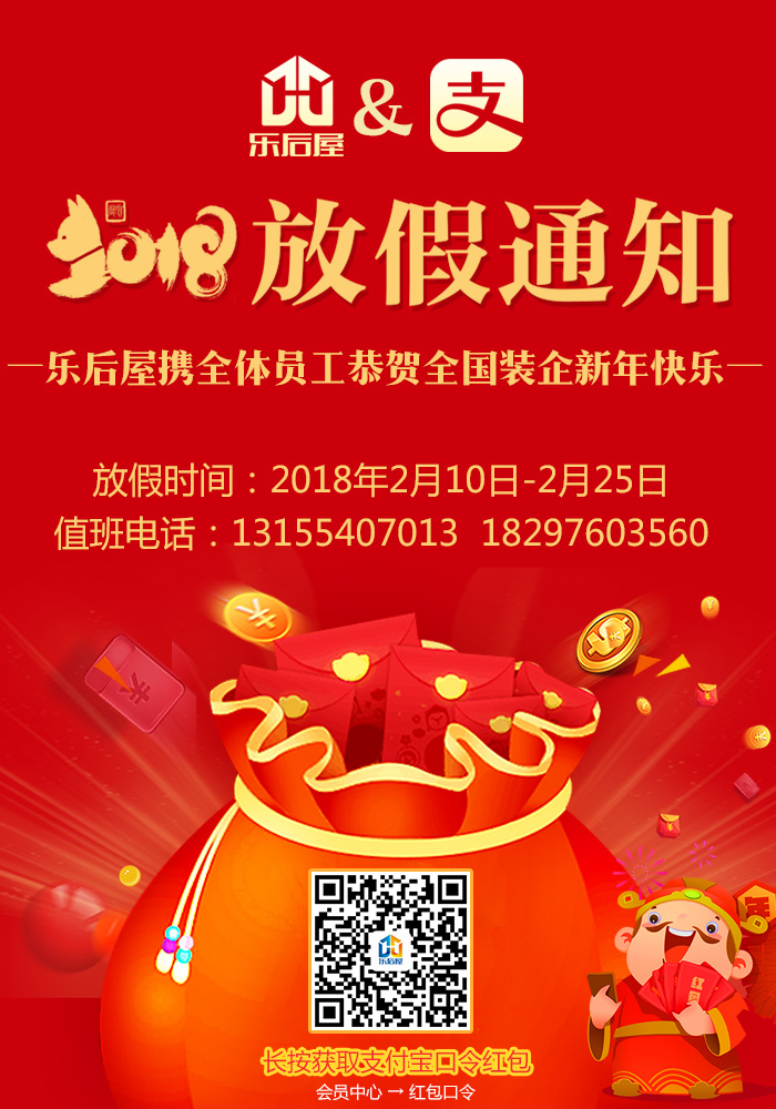 新春佳節漸近,為歡度中華民族的傳統佳節,樂后屋裝企營銷平臺恭祝新老客戶新年快樂,感謝一直以來對我們的支持,2018年我們與您一路前行!
